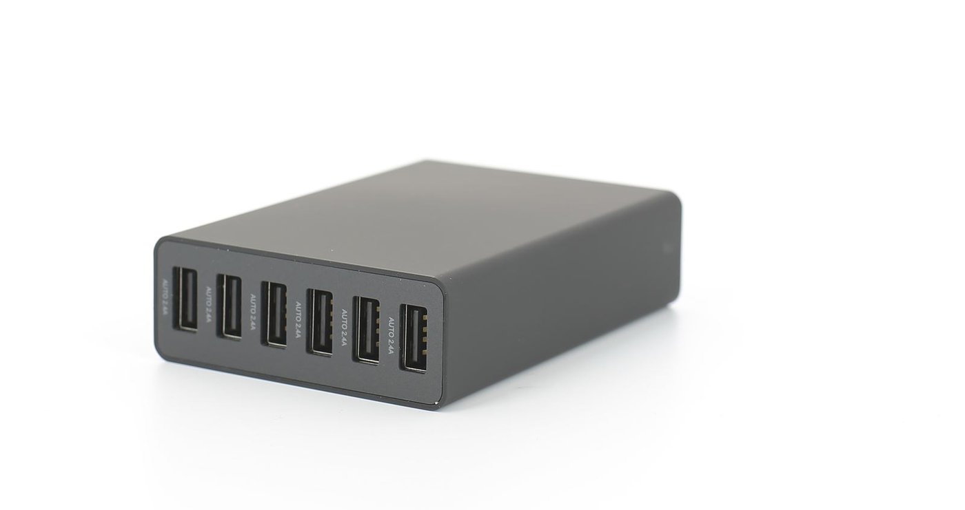USB-lader med seks porter for samtidig lading av mobiler, nettbrett og andre USB-enheter. Leverer totalt 50 W (10 A, maks. 2,4 A/port) og kan derfor lade f.eks. fire nettbrett samtidig. Inngangsspenning: 100–240 V. Standby: >0,15 W. C7-strømkabel medfølger. Mål: 100x70x26 mm.