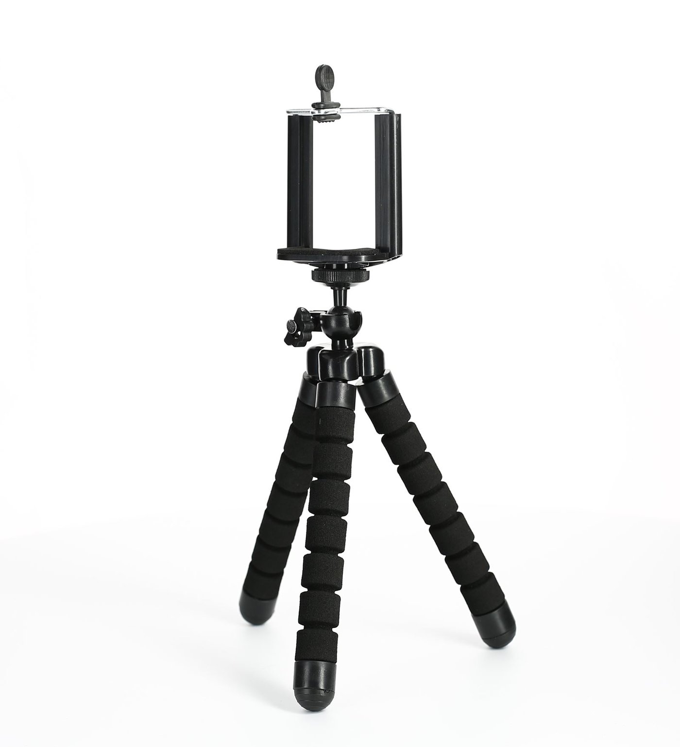 Lite trebensstativ for kamera eller mobil. Leveres med universalfeste (kan åpnes 55-85 mm) for feste av mobil. Bena har gummiføtter og er fremstilt av fleksibelt materiale. Med kuleledd for fleksibel innstilling av kamera/mobil. Har standardgjenger på 1/4" (6,4 mm). Høyde: 170 mm.