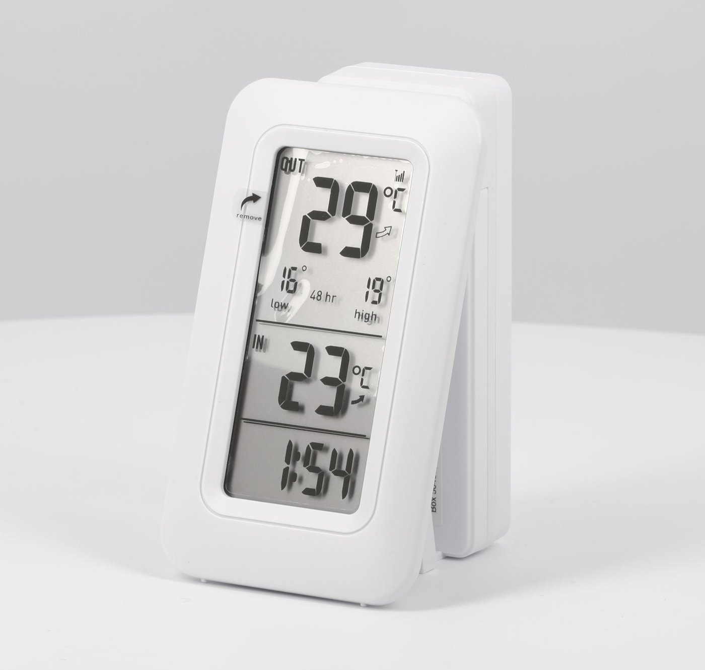 Trådløst inne- og utetermometer med klokke. Elegant design med display som viser temperatur og trend basert på tidligere verdier. Minne for høyeste og laveste utetemperatur.