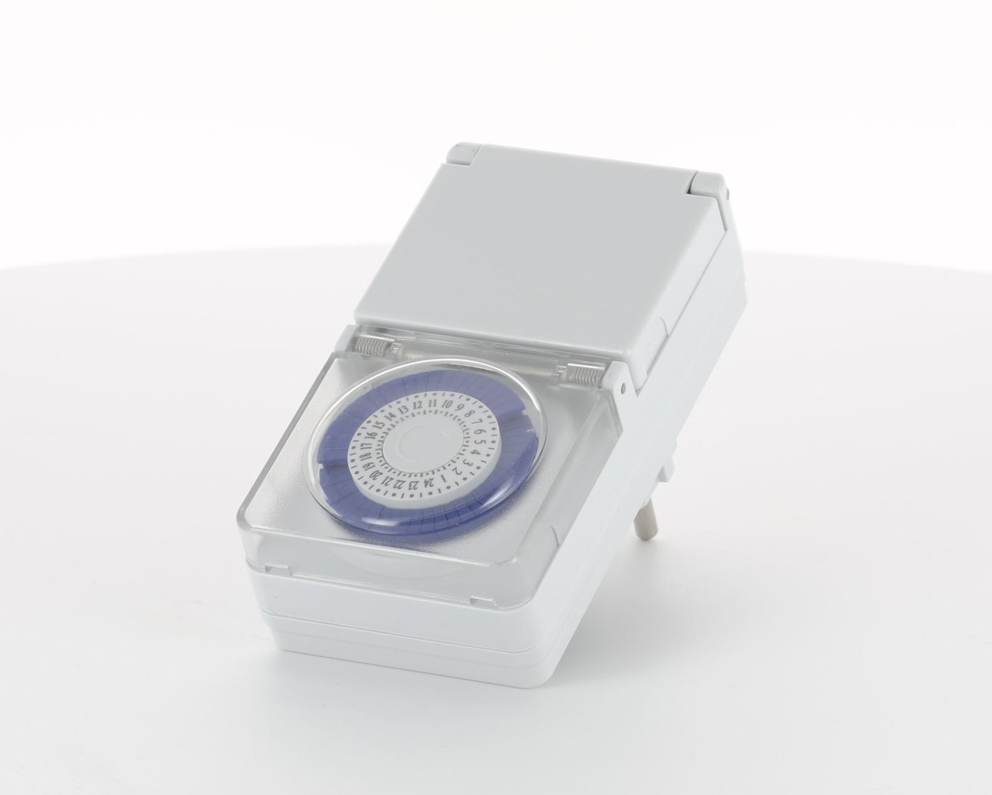 Jordad timer med mekanisk 24 h-skiva för utomhusbruk (IP44). Kan slå på och av ansluten apparat med 30 minuters-intervall. Lägsta funktionstemperatur: -25°C. Maxbelastning: 3680 W.