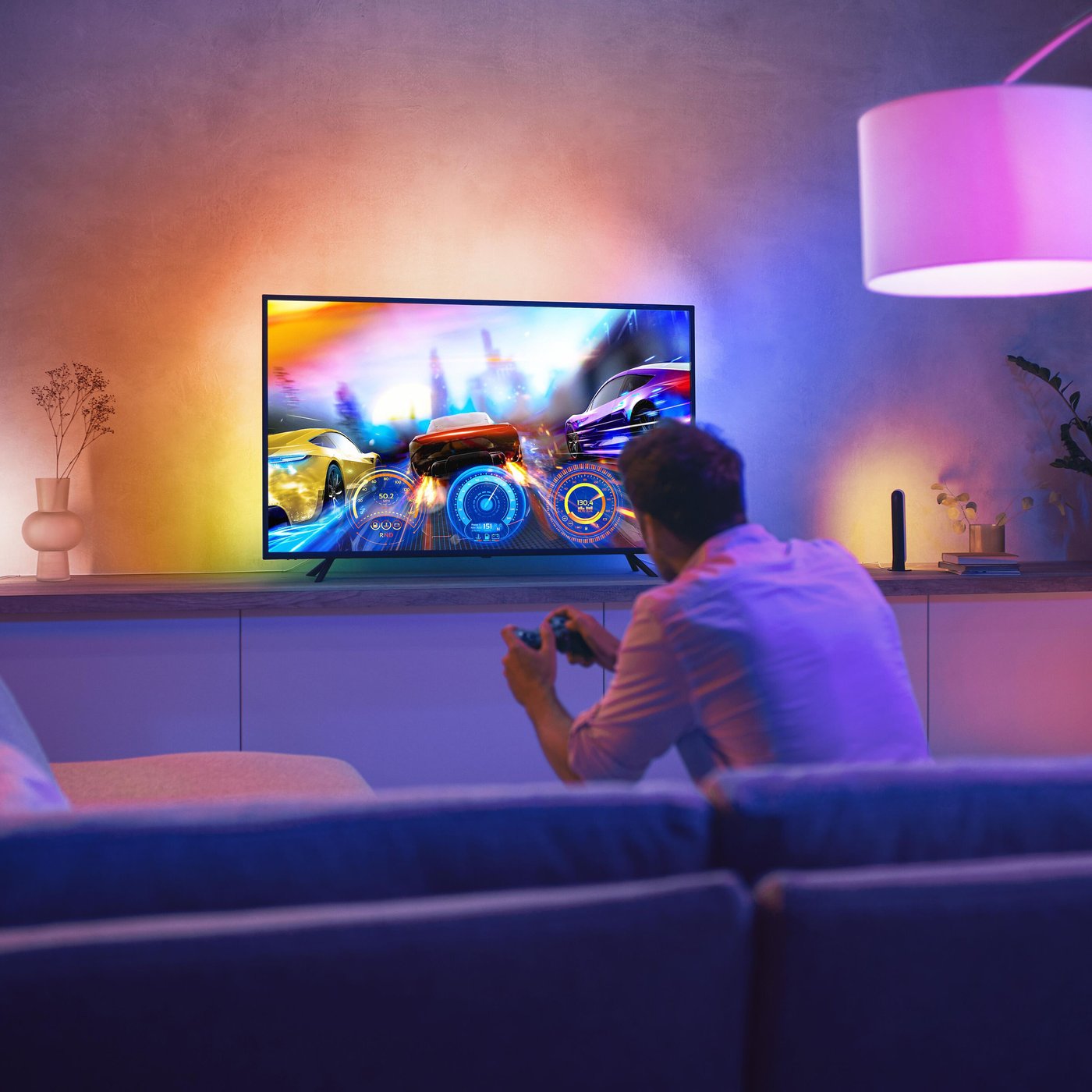 Med Philips Hue Play HDMI Sync Box och tillhörande lampor och ljusslingor får du en komplett och lyxig upplevelse som är enkel att installera. Bygg ett system med HDMI-boxen och den självhäftande ljusslingan Hue Play Gradient TV Lightstrip, och komplettera med andra Hue-lampor för ljuseffekter som sprider sig i hela vardagsrummet.