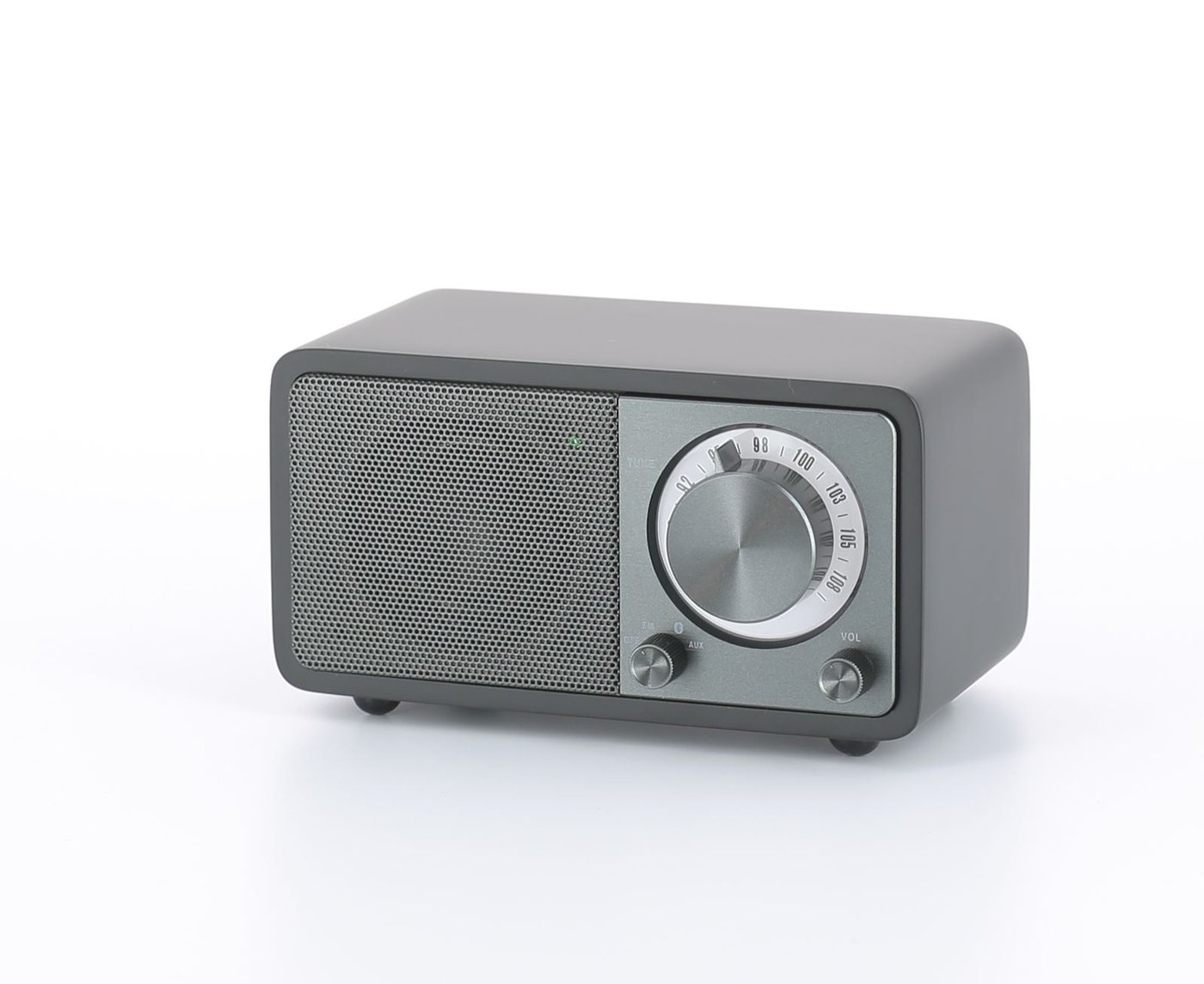 FM-radio med detaljer av trä och analog LED-belyst tuner. Utrustad med Bluetooth och 3,5 mm-ingång för tillkoppling av t.ex. mobiltelefon. Två rattar styr ljudkälla och volym. Batteritid: upp till 36 h. Inbyggt Li-ion-batteri som laddas upp med medföljande Micro-USB-kabel. Mått: 116x65x73,5 mm.