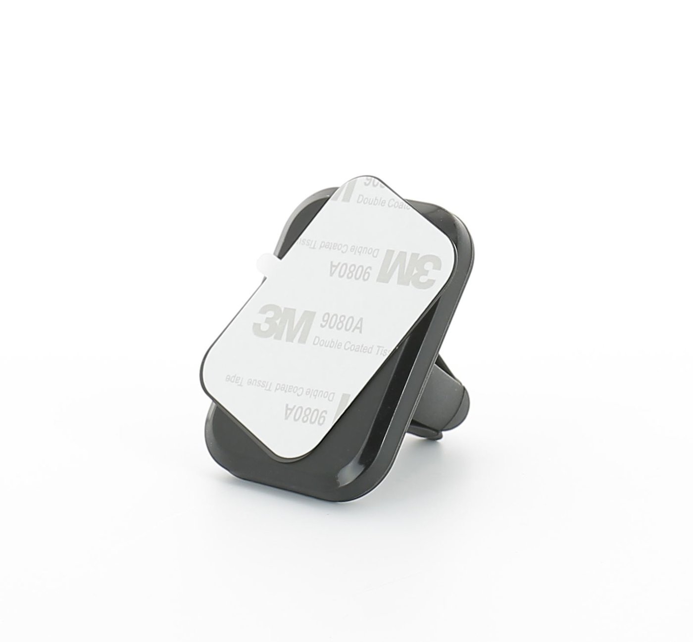 Universell mobilhållare som monteras i bilens fläktgaller och håller mobilen på plats med den inbyggda magneten. Levereras med en tunn metallplatta som kan läggas mellan mobilen och mobilskalet, samt en tunn metallplatta med självhäftande tejp (permanent). Vid användning av större mobiler rekommenderas att metallplattan fästs på utsidan av skalet. Hållaren kan även användas direkt med magnetiska mobilplånböcker.