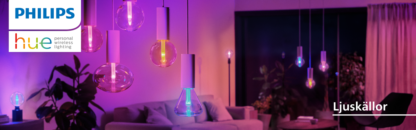 Hue-ljuskällor finns i olika färger, socklar och storlekar. White-serien innehåller ljuskällor som avger vitt, dimbart ljus vid samma färgtemperatur (2700 Kelvin). White Ambiance möjliggör justering av både ljusstyrka och färgtemperatur, med ljuset fritt justerbart till 50 000 nyanser av varmt till kallt vitt. White and Color Ambiance är serien som erbjuder både trådlös ljusreglering och inte bara anpassning till tusentals vita nyanser utan även till miljontals färger. I sortimentet ingår de tre uttagen E27, E14 och GU10. E27 är det vanligaste uttaget medan E14 främst används till mindre armaturer som små bordslampor eller ljuskronor. GU10 är det vanligaste uttaget för spotlights.