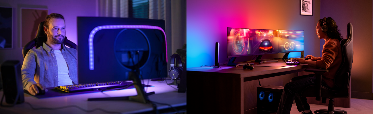 Förhöj din PC-spelupplevelse med Hue Surround-belysning. Synkronisera dina lampor med dina spel för att skapa en helt uppslukande miljö som reagerar på varje åtgärd på skärmen. Från explosiva strider till subtila detaljer i spelet kommer du att känna att du är mitt i händelsernas centrum. Hue Sync appen för PC finns gratis att ladda ned. Allt du behöver är en Gradient Lightstrip för PC.