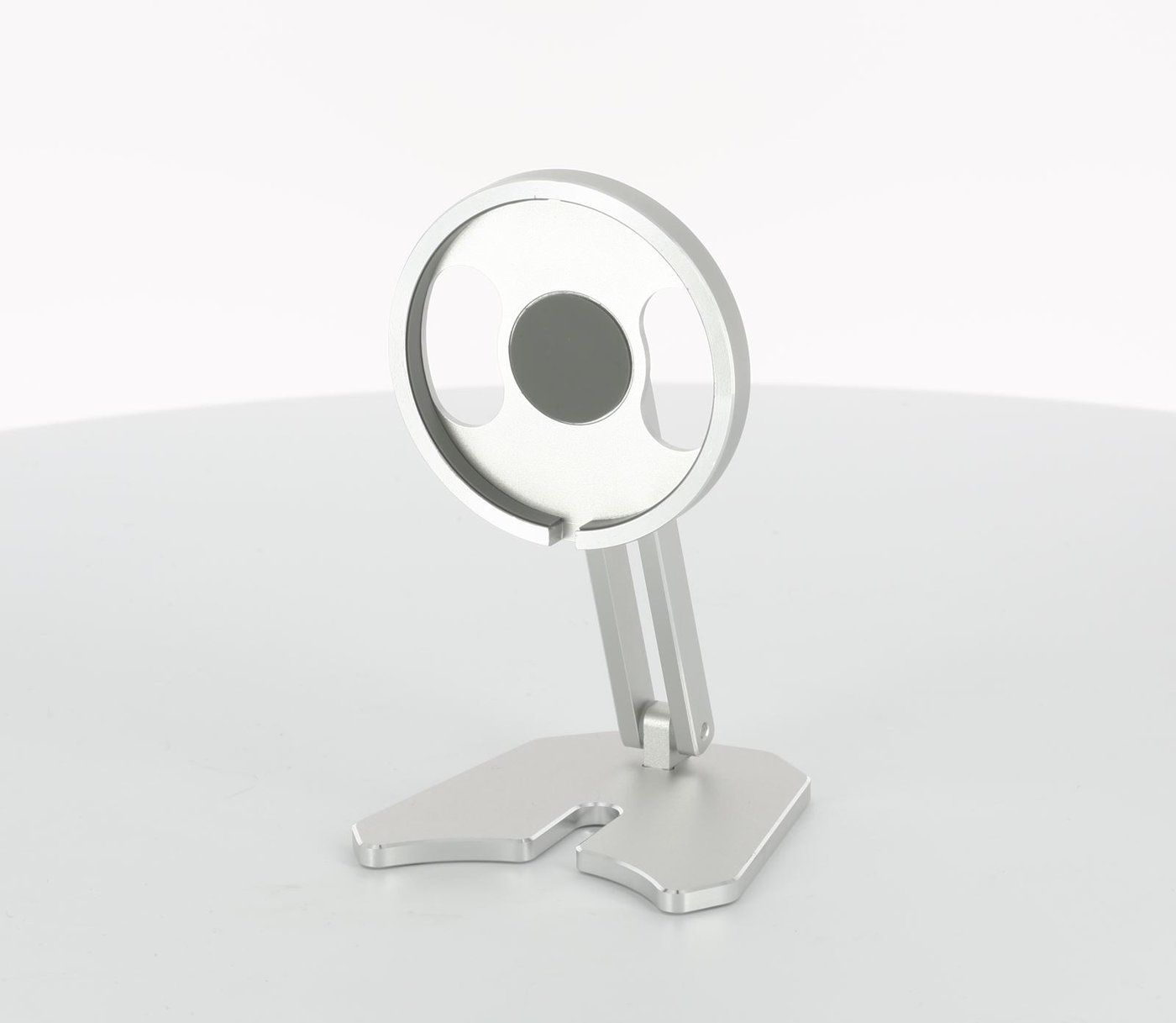 Ställ i borstad aluminium som låter dig ladda din iPhone 12 och senare med stil. Gör det lätt att läsa notifikationer och använda mobilen vid skrivbordet, på köksbänken eller vid sängen, utan att behöva plocka upp telefonen. Placera bara din Magsafe-laddare(säljes separat) i stället och placera sedan din mobil mot laddaren. Justerbar vinkel och hopfällbar. Mått: 124x71x16 mm.