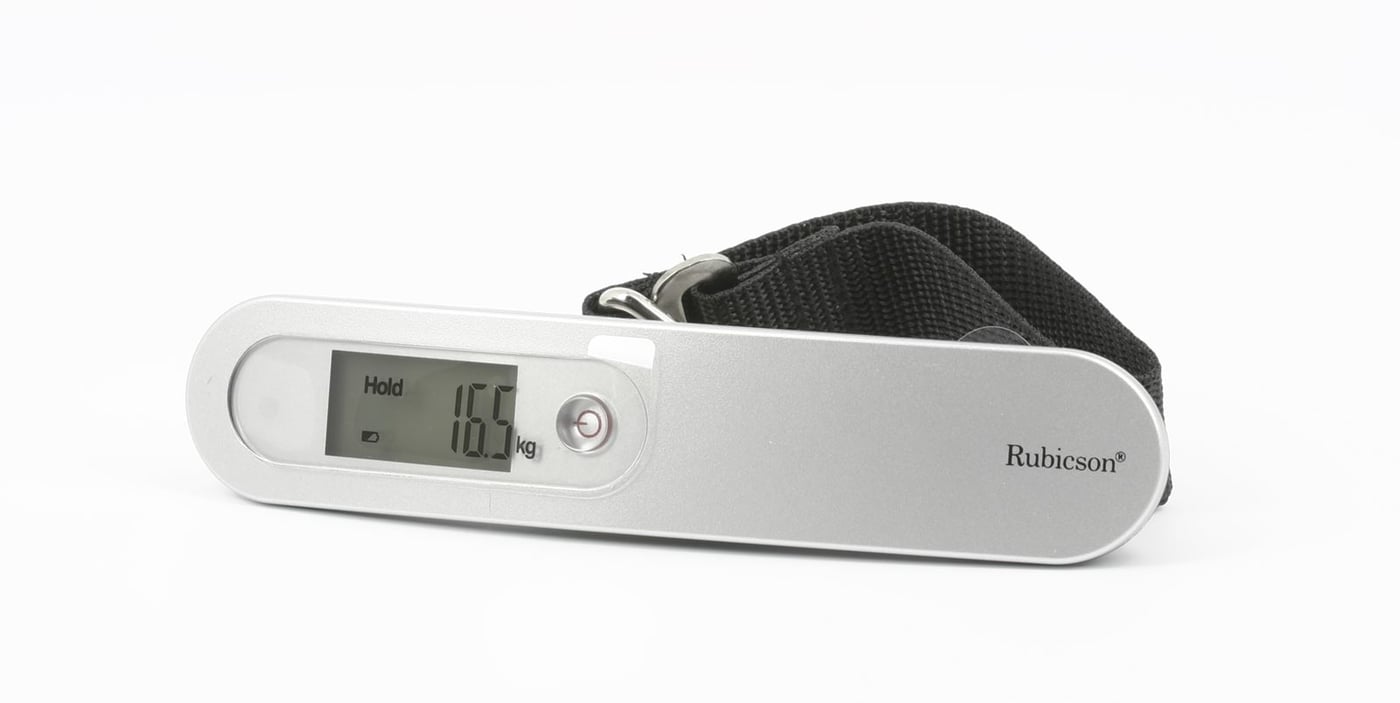 Extra kraftig bagagevåg som väger upp till 50 kg. Rem med metallspänne för upphängning av väskan samt ett greppvänligt handtag. Hold-funktionen låser mätvärdet automatiskt när det stabiliserats. Bakgrundsbelyst och lättläst display. Upplösning: 10 g. Maxbelastning: 50 kg. Batteri: 1x CR2032 (medföljer).